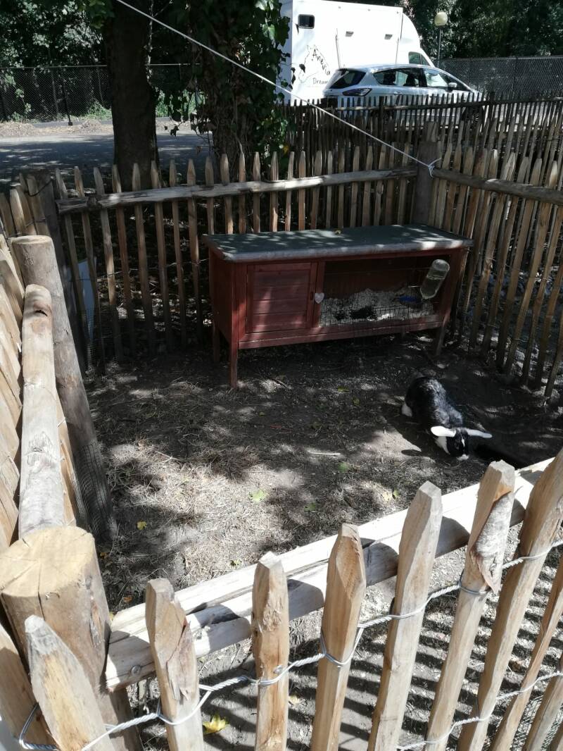 Buiten hebben de konijnen en cavia's hun eigen stukje om vrij te lopen met een nachthok. Ze staan allemaal apart van elkaar, ze kunnen elkaar wel ruiken en zien.