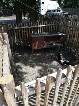 Buiten hebben de kippen, konijnen en cavia's hun eigen stukje om vrij te lopen met een nachthok. Ze staan allemaal apart van elkaar, ze kunnen elkaar wel ruiken en zien.